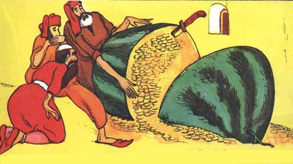 Пришлось Хасану звать на помощь друзей. С трудом привезли они арбуз в кишлак. Внесли в дом. Разрезали. И к ногам изумленных бедняков посыпались золотые монеты. Много, много золотых монет...