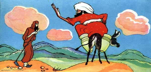 Ехал однажды Аджар-бай по своим полям и пересчитывал деньги, полученные с бедняков. Но что это? В сумке оказалось только девяносто девять монет. Еще одна - и было бы ровно сто. Сто таньга! Расстроился жадный Аджар-бай. Где взять еще одну таньга?
