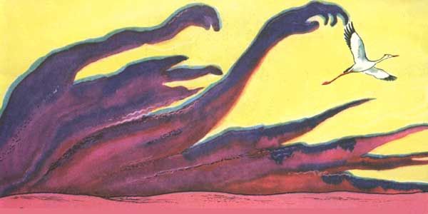 Случилось так, что в это самое время пролетал над землей злой ветер-Гамсын. "Дыханием смерти" называют его на Востоке. Все живое, что попадается на пути, сжигает этот ветер. Увидел Гамсын в небе Аиста и погнался за ним. Злые тучи, словно костлявые руки, потянулись к птице. Ускользает, увертывается от смертельных объятий Гамсына Аист. Но все медленнее он летит. Все слабее становятся его крылья. Наконец, догнал птицу Гамсын, закружил и... Аист стал падать вниз.