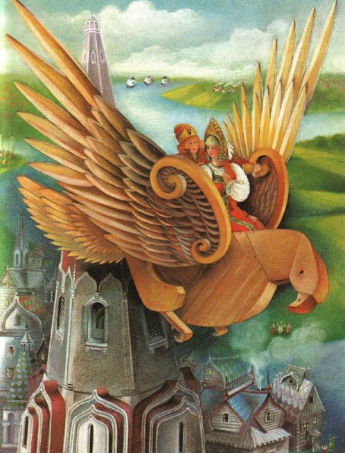 И вдруг видит — летит по небу орел деревянный, а на нем царевич, да не один, а с девушкой-красавицей.