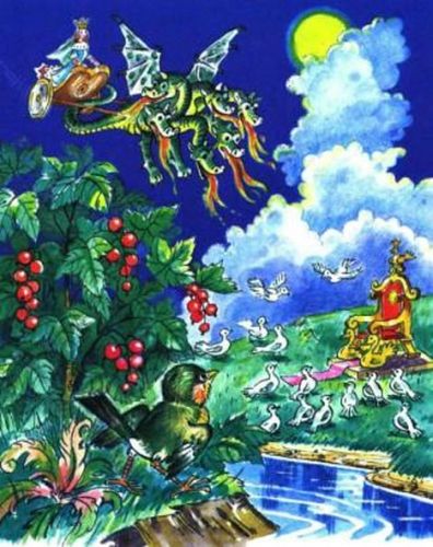 Вот сошла Елена Премудрая с золотого трона, села на свою колесницу и понеслась по воздуху к своему чудесному дворцу; следом за ней и малиновка полетела.