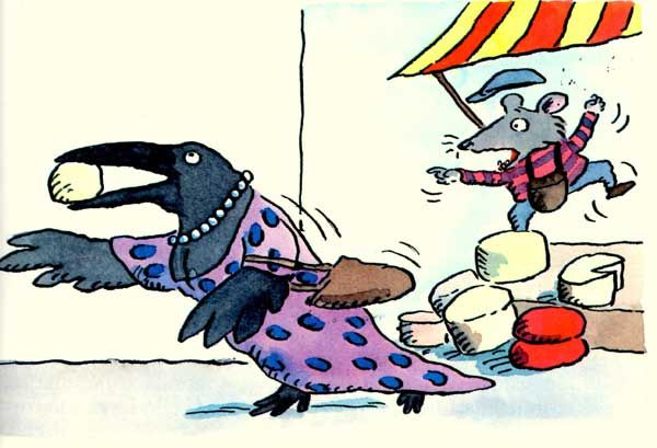 Однажды, прогуливаясь по базару, мадам Ворона увидела сырный лоток. Чего на нём только не было! Каких только сортов! Английский чеддер, французский камамбер, итальянская моцарелла, швейцарский грюйер... Сыры имели такой аппетитный вид, что у Вороны разбежались глаза: на каком из них остановить свой выбор?