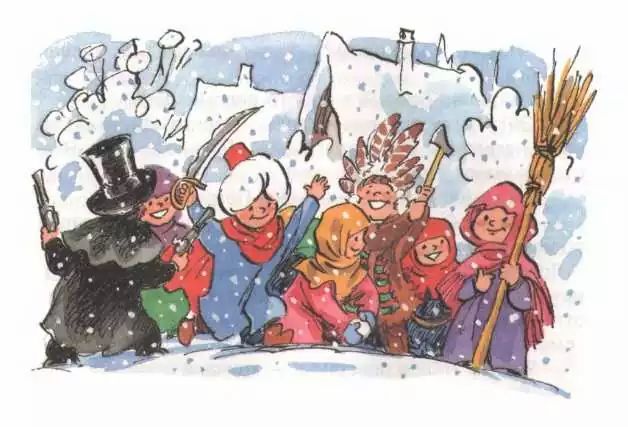 Как попали негритята на заснеженную деревенскую улицу? С каких пор разгуливают здесь индейцы и турки? Индейцы — с перьями на шапках, с разрисованными лицами, и турки — в красных фесках с кисточками и в широченных шароварах.