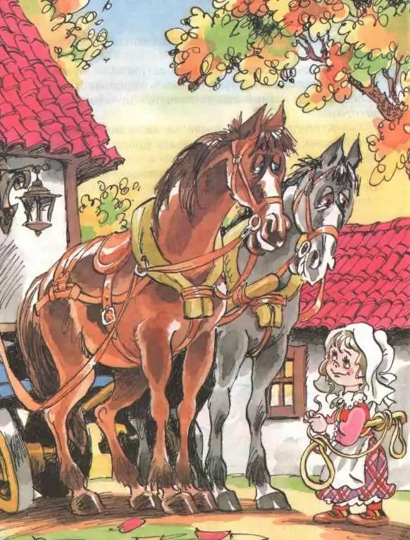 Маленькая Баба-Яга спряталась за сараем. Когда возчик скрылся в трактире, она выскочила, подбежала к лошадям и быстро спросила их на лошадином языке: