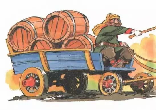 Вылетев в печную трубу, полетели они над лесом и дальше — над осенними лугами. Повсюду сверкали лужи. Дороги раскисли. Одинокие путники шлёпали там по щиколотку в грязи. По дороге медленно ползла телега, тяжело нагруженная пивными бочками. В упряжке выбивалась из сил пара лошадей. Они медленно двигались по плохой дороге. Лошади старались изо всех сил, но воз был тяжёл, а дорога вязкая. Возчик злился.