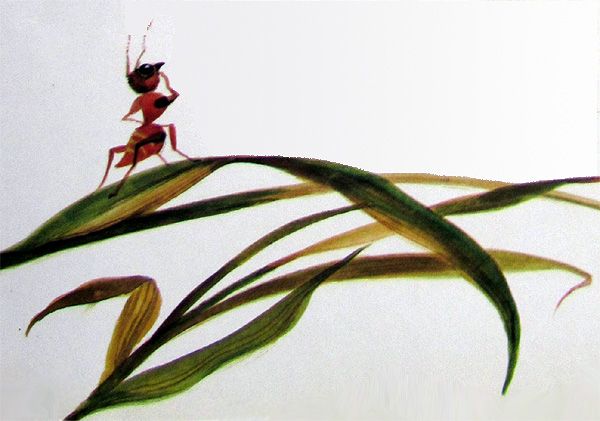 Муравей заглянул в небо, увидел голубку и не смог оторвать от нее глаз, у него даже закружилась голова от вида такой нежной красоты. Муравей поскользнулся и упал в ручей. Вода в ручье текла торопливо и быстро понесла испуганного Муравья с собой.