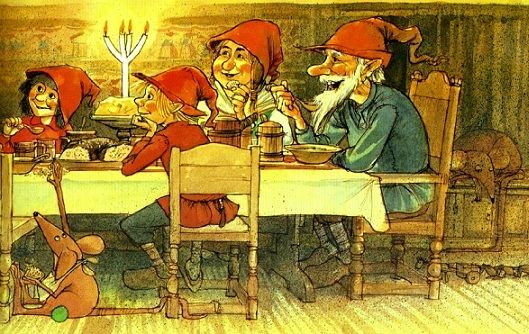 Мать семейства накрывала на стол, а Пулька помешивал кипящее варево в большом котелке над огнем. Он ведь уже большой, скоро одиннадцать лет. Задание это считалось почетным в семье гномов, потому что рождественский ужин был самой торжественной трапезой в году.